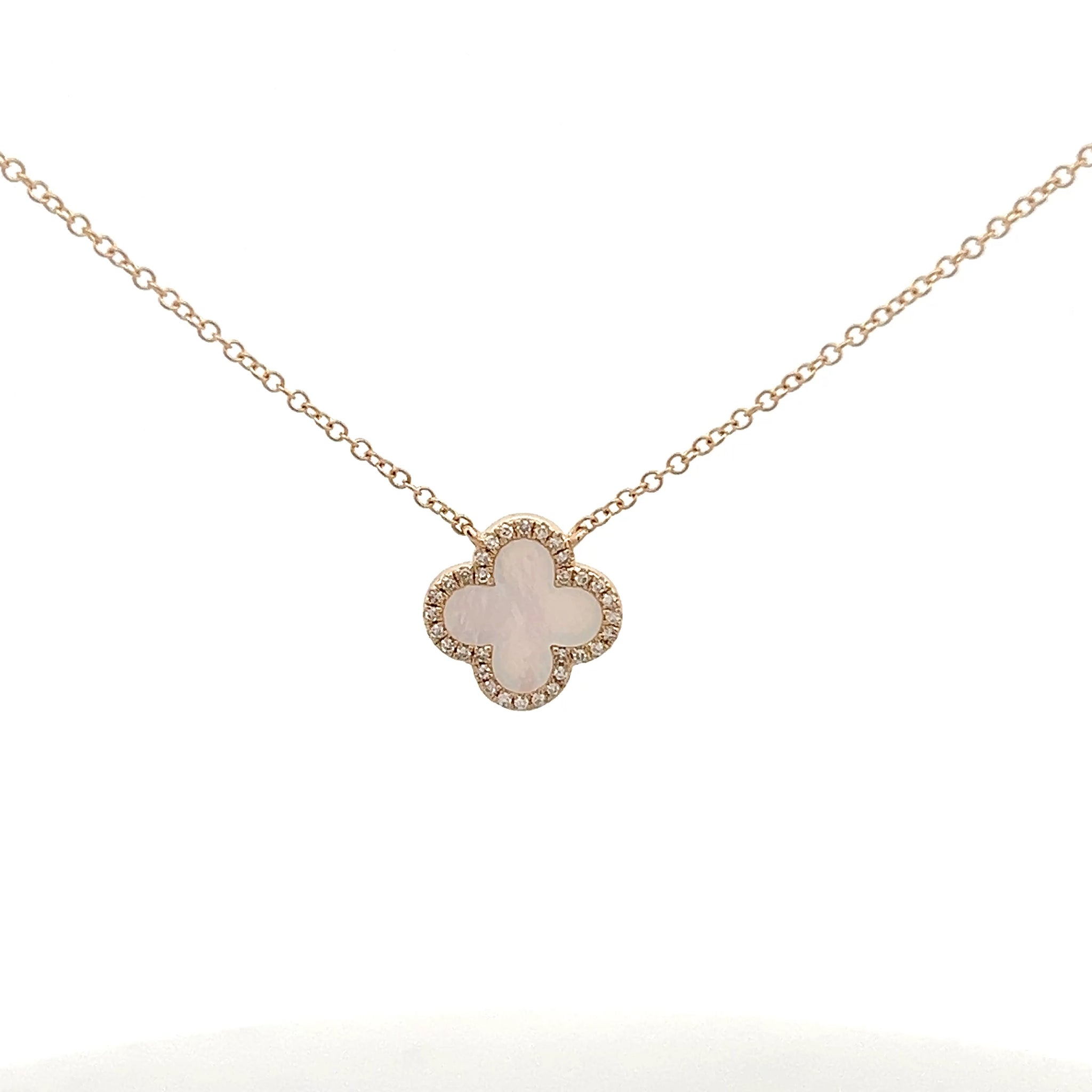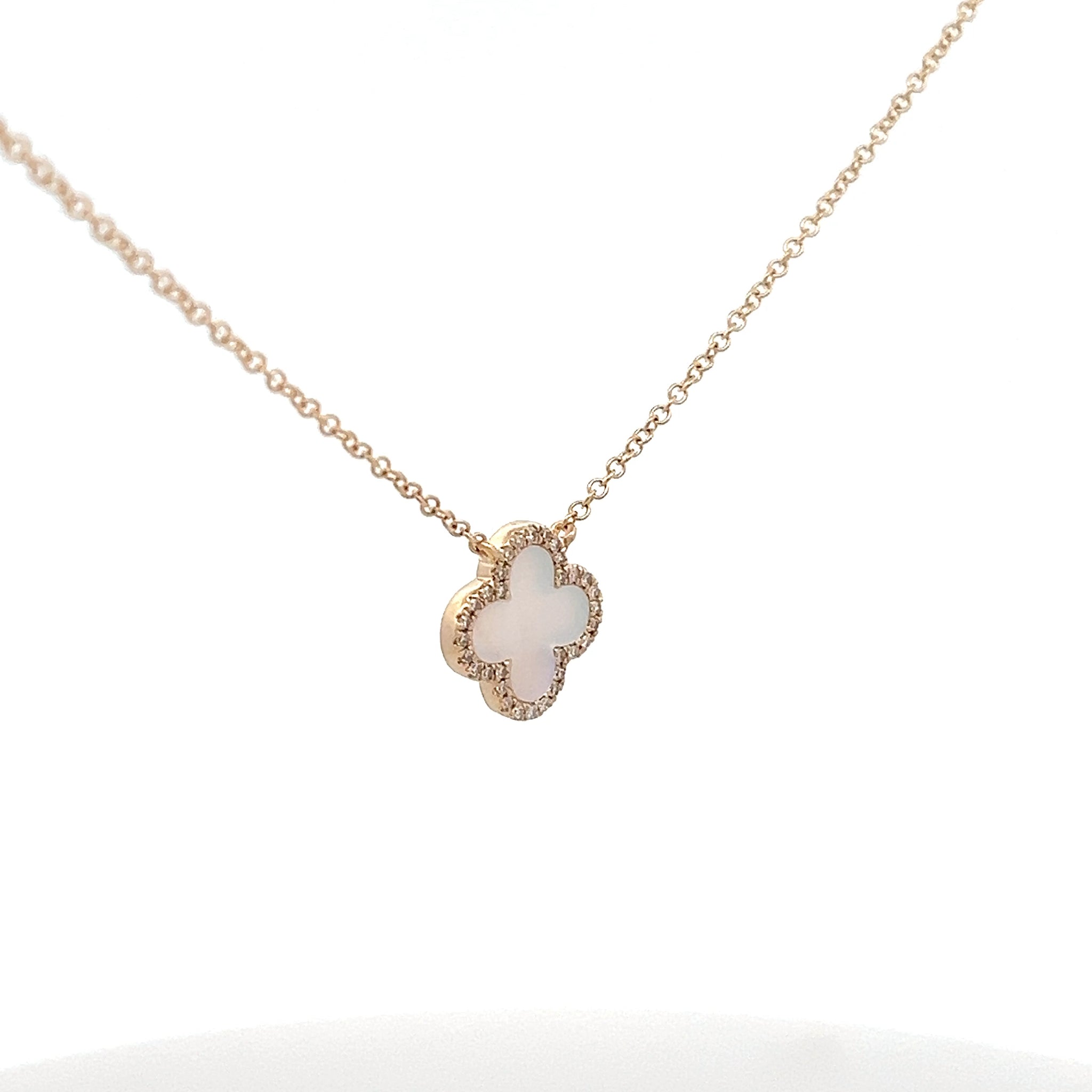 14k Yellow Gold Mother of Pearl Clover Necklace with Diamonds .08ct 18”